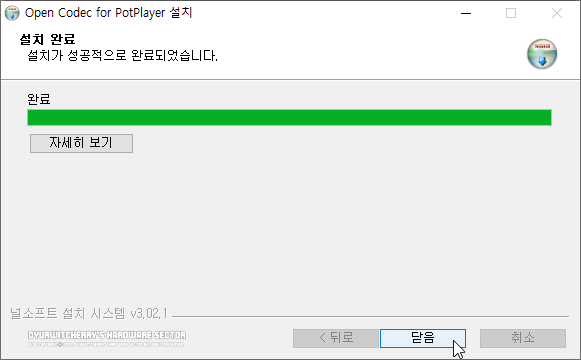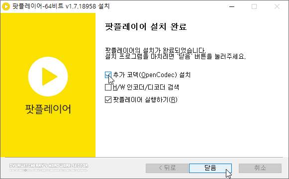 팟플레이어 추가 코덱 설치하는 방법은 'PotPlayer 1.7.18958 버전 설치 완료 시 '☑ 팟플레이어 실행하기(R)' 항목과 함께 기본 값에 체크되어 있는 '☑ 추가 코덱(OpenCodec) 설치'가 체크 되어 있는 상태에서 '닫음' 버튼을 누르면 실행되는 'OpenCodec for PotPlayer 설치'과정에서 진행할 수 있습니다. 참고로, 팟플레이어 설치 시 추가 코덱을 설치하지 않은 경우에는 PotPlayer를 다시 설치하는 방법을 이용해도 됩니다.