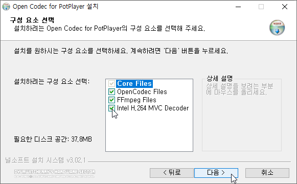 설치하려는 구성 요소 선택의 기본 값에서는 음영 처리되어 필수 설치 되는 '☑ Core Files'와 함께 '☑ OpenCodec Files' 항목에 체크 되어 약 5.4MB의 디스크 공간을 필요로 하고, 사용 환경에 따라 '☑ FFmpeg Files'와 '☑□ Intel H.264 MVC Decoder'를 추가 설치햐면 필요한 디스크 공간은 37.8MB 이며, '다음 >' 버튼을 누르면 설치 위치 선택 단계가 진행 됩니다.