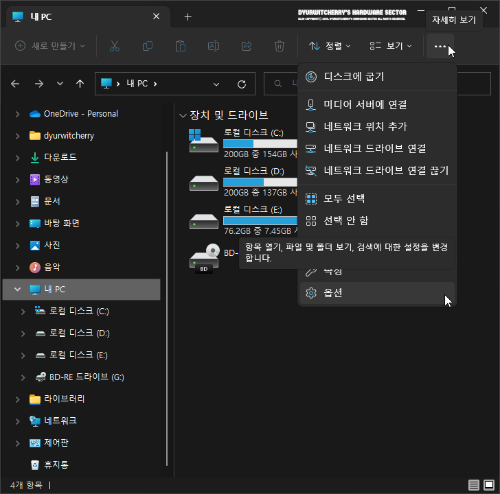 윈도우 11 파일 탐색기의 최근에 사용한 문서 등의 파일과 열어본 폴더 등의 자주 사용하는 폴더 등의 사용 기록 삭제하는 방법은 먼저, 윈도우 11 시작 메뉴 또는 작업 표시줄의 파일 탐색기를 선택하거나 단축키 'Windows ⊞ + E' 키를 눌러 파일 탐색기를 실행 합니다. 파일 탐색기가 실행 되면 상단 도구 모음 오른쪽의 '⋯' 자세히 보기 메뉴 아이콘을 클릭하여 아래로 롤오버 되는 세부 메뉴 중 '☼ 옵션' 항목을 선택 합니다.