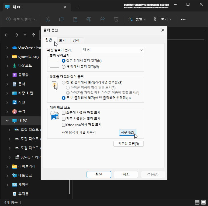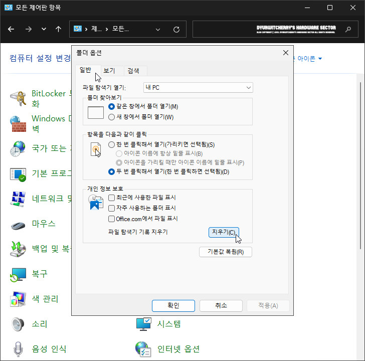 제어판에서 폴더 옵션 창이 활성화 되면, 상단 '일반' 탭의 '개인 정보 보호' 항목의 '파일 탐색기 기록 지우기' 우측의 '지우기(C)' 버튼을 누르면, 최근에 사용한 파일과 자주 사용하는 폴더 표시, Office.com에서 파일 표시 및 열어본 파일, 검색 등의 윈도우 11 파일 탐색기 사용 기록이 삭제 됩니다. 참고로, 제어판의 파일 탐색기 옵션을 이용하는 방법과 파일 탐색기에서 폴더 옵션을 이용하는 방법 중 접근하기 편리한 방법을 선택하여 파일 탐색기 사용 기록을 삭제하면 됩니다.