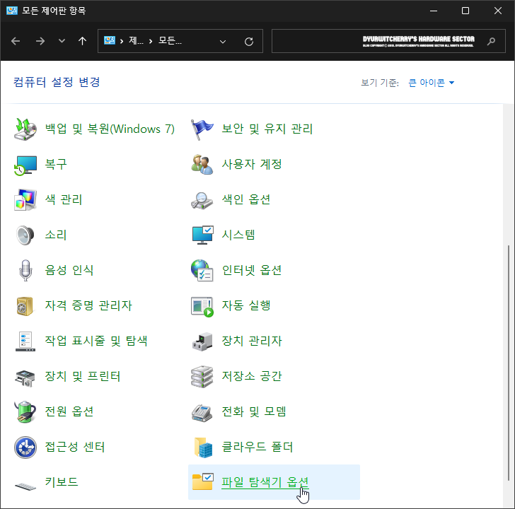 제어판에서 Windows 11 파일 탐색기 사용 기록 삭제하는 방법은 제어판의 '모든 제어판 항목'에서 '파일 탐색기 옵션' 항목을 클릭 합니다. 참고로, 제어판 범주 '보기'에서는 '모양 및 개인 설정'에서 '파일 탐색기 옵션'을 선택하면 됩니다.