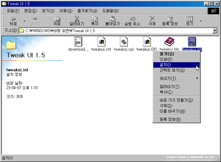 윈도우 98 설정 프로그램 트윅 UI 다운로드 및 설치하는 방법은 첨부파일의 파일크기 약 0.08MB인 'Tweak UI 1.5.zip' 파일을 다운로드 받아 압축을 해제하고, 폴더 내 'tweakui.inf' 파일에 마우스 오른쪽 버튼을 눌러 '설치(I)'를 선택하면 'Tweak UI' 설치가 됩니다.
