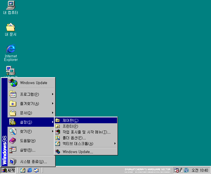 윈도우 98에 트윅 UI를 설치하면 시작 메뉴에 프로그램이 추가되지 않고 제어판 항목에 추가 됩니다. Tweak UI 1.5 실행하는 방법은 먼저, Windows 98의 시작 버튼을 눌러 '☼ 설정(S) - 제어판(C)'을 선택합니다.