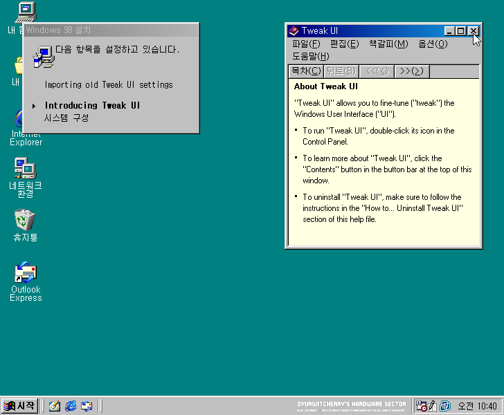 트윅 UI 설치는 'Windows 98 설치' 창이 활성화 되면서 '다음 항목을 설정하고 있습니다. Import old Tweak UI settings ▸ Introducing Tweak UI 시스템 구성'이 표시되며, 우측의 'Tweak UI' 도움말 파일의 '×' 닫기 버튼을 누르면 설치가 완료 됩니다.