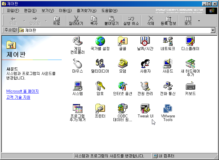 윈도우 98 제어판을 실행하면 트윅 UI가 정상적으로 설치 'Tweak UI' 아이콘이 추가되어 있는 것을 확인할 수 있으며, Tweak UI를 더블 클릭하면 프로그램이 실행 됩니다.