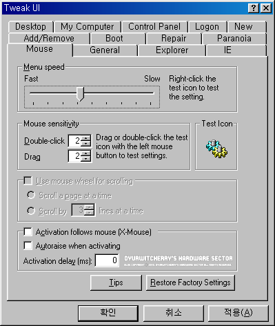 트윅 UI 프로그램이 실행되면 기본 탭인 Mouse 탭으로 시작 되어 총 13개 탭으로 구성되어 있는 세부 항목에서 윈도우 시스템 설정을 변경할 수 있으며, 설정 항목의 세부 항목을 '☑' 체크 또는 '□' 체크 해제하거나 '◉' 라디오 버튼을 선택하여 옵션을 변경한 후 '확인 - 적용(A)'을 누르면, 설정 값이 적용 됩니다. 참고로, 포스팅에서는 Windows 98 Second Edition이 설치되어 있는 시스템에 트윅 UI를 설치하는 방법을 소개한 것으로, Windows 95와 2000, NT와 XP에서도 동일하게 설치하고 사용할 수 있습니다.