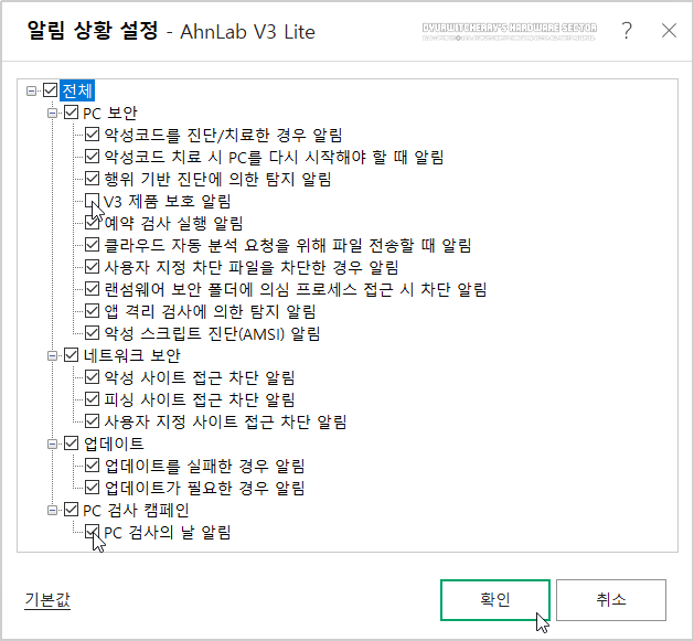 선택한 상황에 알림 창 표시의 설정 버튼을 클릭하여 '알림 상황 설정 - AhnLab V3 Lite' 창이 활성화 되면, '☑' 전체' 항목 외에 '□ V3 제품 보호 알림' 항목만 체크해제 되어 있는데, '☑ PC 보안'과 '☑ 네트워크 보안', '☑ 업데이트'와 '☑ PC 검사 캠페인' 등의 주요 항목을 선택하여 '☑' 체크 또는 '□' 체크해제 하거나 개별 항목 중 '☑ PC 검사의 날 알림 등' 시스템 보호와 연관성이 없는 사항을 체크 해제하고 '확인' 버튼을 누르면 적용 됩니다. 참고로, 알림 상황 설정 창 하단의 '기본값' 메뉴를 클릭하면 초기 설정 상태로 복원 되며, 캡처한 이미지도 기본 옵션 상태 입니다.
