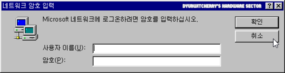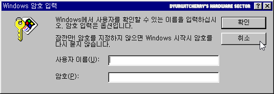 윈도우 95 시스템이 다시 시작되면, 바탕화면에 진입하기 전에 'Windows 암호 입력' 창이 활성화 되어 'Windows에서 사용자를 확인할 수 있는 이름을 입력하십시오. 암호 입력은 옵션입니다. 잠깐만! 암호를 지정하지 않으면 Windows 시작시 암호를 다시 묻지 않습니다.'의 '사용자 이름(U):'과 '암호(P):'를 공란으로 아무것도 입력하지 않은 상태에서 '취소' 버튼 또는 사용자 이름만 입력하고 '확인' 버튼을 누르면, Windows 95 네트워크 암호 입력 없이 자동 로그인 설정이 완료 됩니다.
