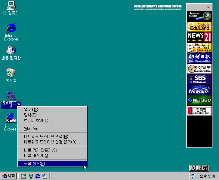 윈도우 95 네트워크 암호 입력 없이 자동 로그인 설정하는 방법은 먼저, 바탕화면의 '네트워크 환경' 아이콘에 마우스 오른쪽 버튼을 눌러 '등록 정보(R)'를 선택 합니다.