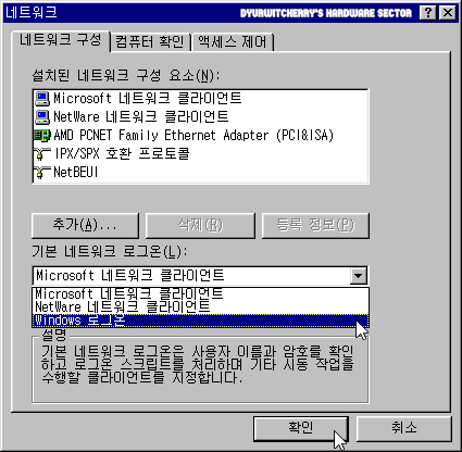 Windows 95 네트워크 환경에 마우스 오른쪽 버튼을 눌러 '등록 정보(R)' 선택하여 '네트워크' 창이 활성화 되면 '네트워크 구성' 탭의 '기본 네트워크 로그온(L):'의 기본 옵션으로 적용되어 있는 'Microsoft 네트워크 클라이언트 ▾'의 하단 콤보 버튼을 눌러 'Windows 로그온'으로 선택한 다음 하단의 '확인' 버튼을 클릭합니다.