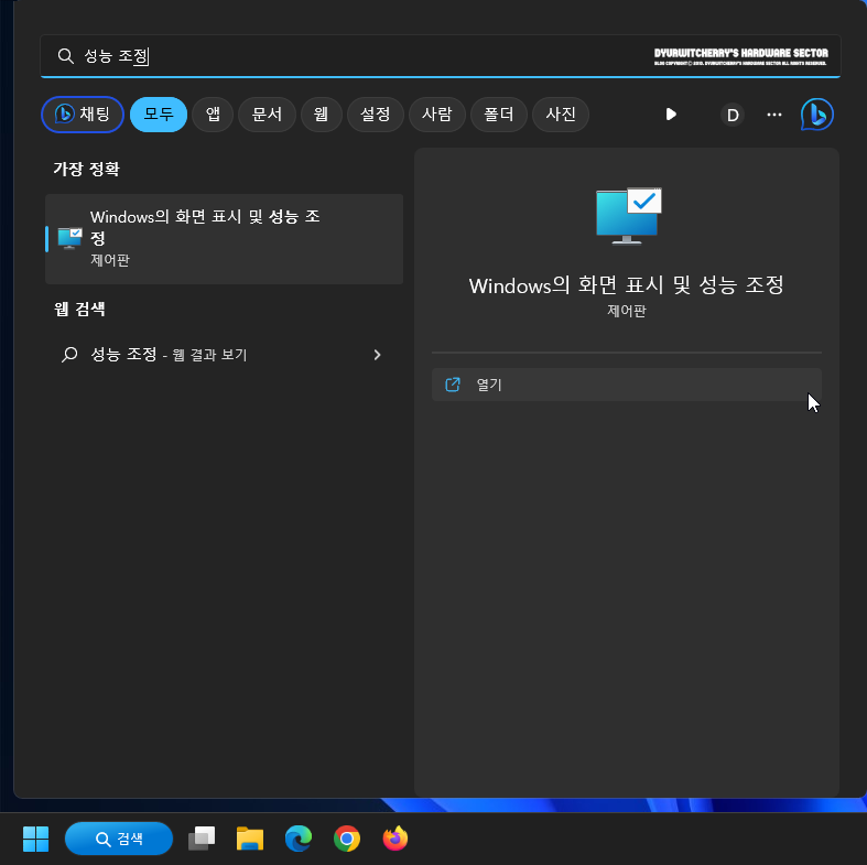 윈도우 11 활성화 된 창 아래 그림자 표시 설정 및 해제하는 방법은 먼저, 시작 메뉴의 '🔍 검색하려면 여기에 입력하세요.' 또는 작업 표시줄의 시작 버튼 옆 '🔍' 검색 아이콘을 클릭하여 검색 창이 활성화 되면 ' 성능 조정' 또는 ' Windows의 화면 표시 및 성능 조정'을 입력한 후 검색 결과의 '열기'를 클릭합니다. 참고로, 키보드에 윈도우 단축키 'Windows ⊞ + S' 또는 'Windows ⊞ + Q' 키를 입력하여 검색 필드를 활성화 할 수 있습니다.