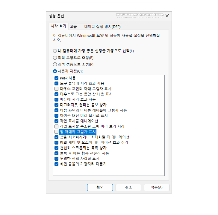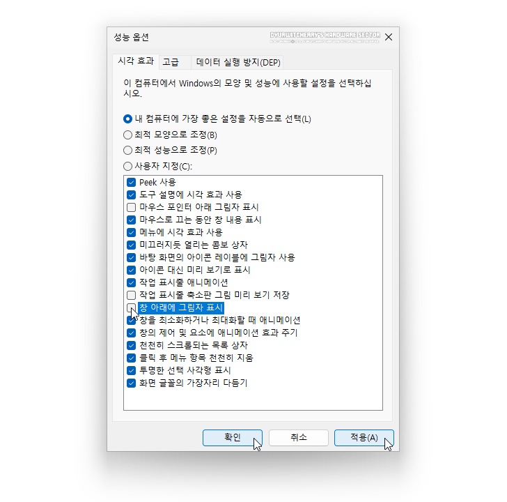 Windows의 화면 표시 및 성능 조정을 실행하면 '성능 옵션' 창이 활성화 되며 '시각 효과' 탭의 기본 값으로 '☑' 체크 되어 있는 '□ 창 아래에 그림자 표시' 항목을 체크 해제하고 '확인 - 적용(A)'을 누르면, 윈도우 11 프로그램과 앱, 설정 등 활성화 된 창 아래 그림자 표시 설정이 해제 됩니다.