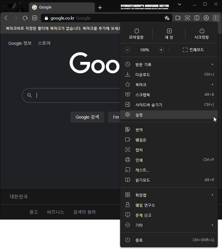 네이버 웨일 브라우저에서 매끄러운 동영상 재생 지원 설정하는 방법은 먼저, Browser 상단 도구 모음 오른쪽의 '⋮' 네이버 웨일 맞춤 설정 아이콘을 클릭하여 하단으로 롤오버 되는 메뉴에서 '☼ 설정'을 선택 합니다.