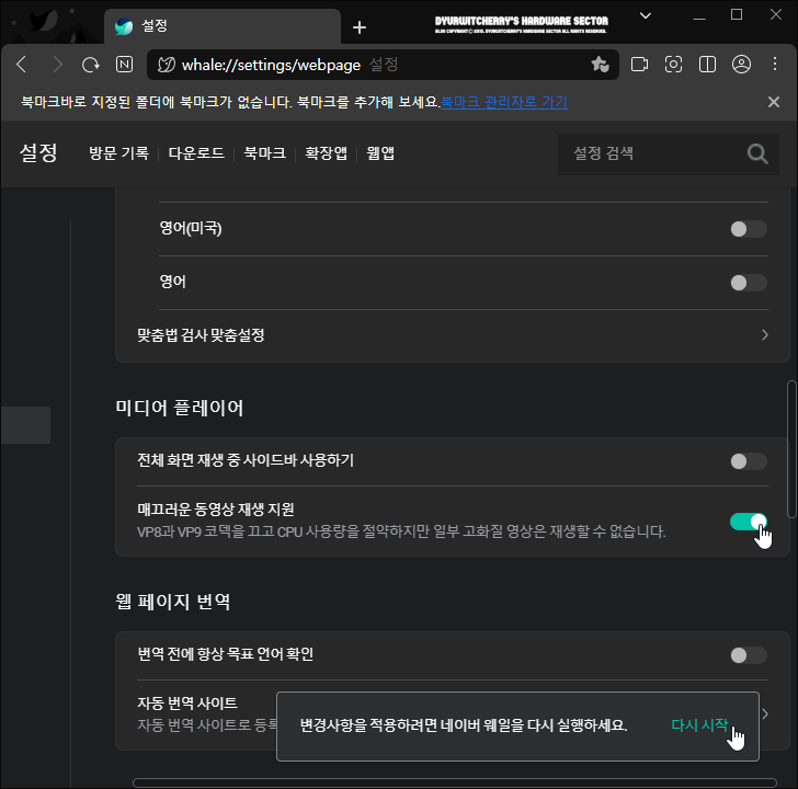 *NAVER 웨일 브라우저 매끄러운 동영상 재생 지원 설정하는 방법