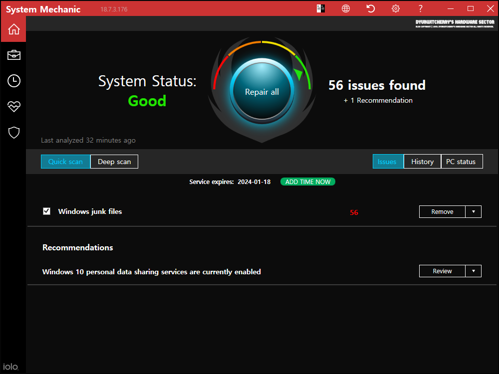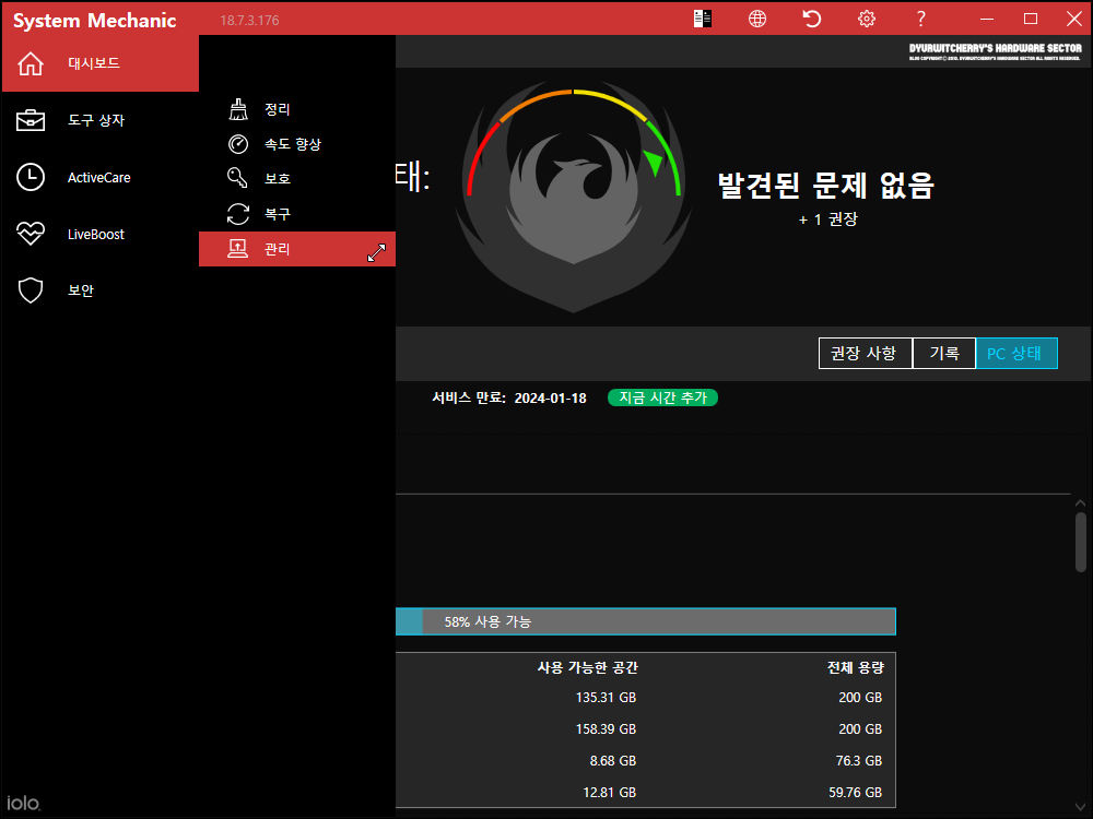 시스템 메카닉 프리 버전이 실행되면 'System Mechanic을 처음 실행하면 분석이 시작됩니다. 이 분석의 결과로 시스템이 변경되지는 않습니다.' 창이 활성화 되며 '확인' 버튼을 누르면 '시스템 분석이 필요함'의 '지금 분석'이 바로 실행 됩니다. 참고로, 시스템 메카닉 System Mechanic 18.7.3.176 버전은 좌측에 대시 보드와 도구 상자, ActiveCare와 LiveBost, 보안 등의 메뉴가 세부 인터페이스로 구성되어 있어 편리하게 사용할 수 있으며, 설치 후 '서비스 만료: 2024-01-18'와 함께 '지금 시간 추가' 버튼을 클릭하여 라이선스를 구매할 수도 있습니다.