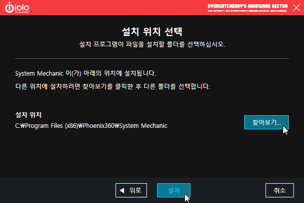 설치 위치 선택의 설치 위치는 'C:\Program Files (x86)\Phoenix360\System Mechanic' 경로가 기본 설치 위치가 적용되어 있어 '찾아보기...' 버튼을 클릭하여 설치 위치를 변경하거나 기본 옵션 상태에서 '설치' 버튼을 누르면 바로 설치가 진행 됩니다. 참고로, System Mechanic 19.x 이후 버전과 다르게 'iolo technologies' 폴더가 아닌 'Phoenix360' 이하 경로에 설치가 됩니다.
