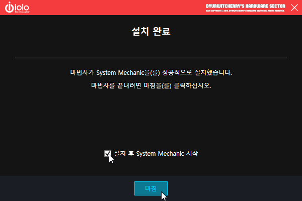 시스템 메카닉 프리 버전 설치 완료가 되면 '☑ 설치 후 System Mechanic 시작' 항목이 기본 옵션으로 체크되어 있으며, '마침' 버튼을 누르면 설치 마법사가 종료 되고 프로그램이 바로 실행 됩니다.
