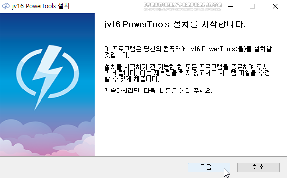 다국어 지원(Multilingual)을 하는 'jv16 PowerTools 8.1.0.1564 Setup.exe' 파일을 더블클릭하여 실행하면 'jv16 PowerTools 설치' 창이 활성화 되며, 설치를 시작하기 전에 실행중인 프로그램을 종료한 다음, 하단의 '다음 >' 버튼을 클릭합니다.