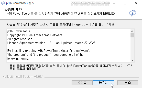 사용권 계약 'jv16 PowerTools(을)를 설치하시기 전에 사용권 계약 내용을 살펴보시기 바랍니다.'의 나머지 세부 내용을 [Page Down] 키를 이용하여 확인한 후 이용 약관에 '동의함'을 선택 합니다.