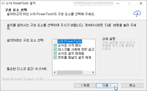 구성 요소 선택 단계의 '설치하려는 구성 요소 선택:'에 음영 처리되어 기본 옵션으로 설치되는 '☑ jv16 PowerTools' 외에 '손쉬운 시작 메뉴(윈도우 시작 메뉴 등록)인 ☑ Start Menu shorcut', '데스크톱 사용에 관한 쉽고 빠른 방법(바탕화면 바로가기 아이콘)인 ☑ Desktop shorcut', '손쉬운 설치 해제법(프로그램 삭제 아이콘 등록)인 ☑ Uninstaller shorcut, '컨트롤 패널의 설치 해제(제어판의 프로그램 제거 메뉴 등록)인 ☑ Uninstaller in Control Panel' 항목이 모두 체크되어 있으며, 또는 체크해제 하여도 설치 파일 크기는 41.8MB이며, 선택항목을 체크하고 '다음 >' 버튼을 클릭합니다.