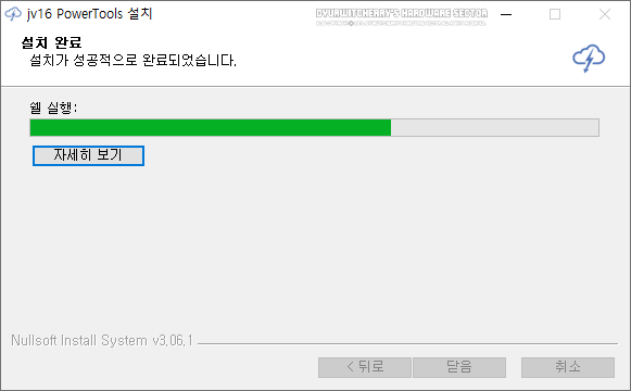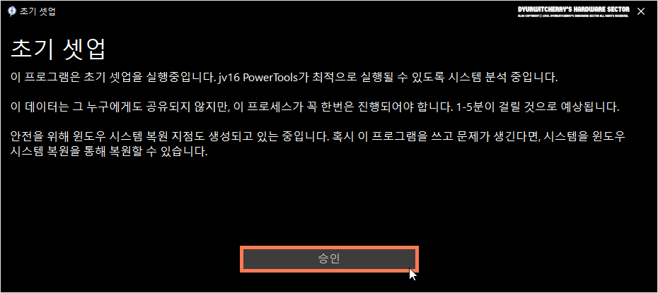 jv16 PowerTools 설치 완료 후 초기 셋업 프로세스는 반드시 한번은 진행되어야 하며, 시스템에 따라 1분 ~ 5분 정도의 시간이 소요 됩니다. 프로그램 사용 시 문제가 발생하는 경우에 윈도우 시스템 복원을 위해 문제를 해결할 수 있도록 사용 시 안전을 위에 윈도우 시스템 복원 지점도 생성 됩니다.