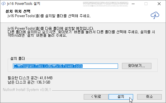 설치 위치 선택의 '설치 폴더'는 'C:\Program Files (x86)\jv16 PowerTools' 경로가 기본 값으로 적용되어 있어 '찾아보기...' 버튼을 이용하여 다른 위치에 선택할 수도 있으며, 설치 위치를 선택한 후 '설치' 버튼을 클릭합니다.