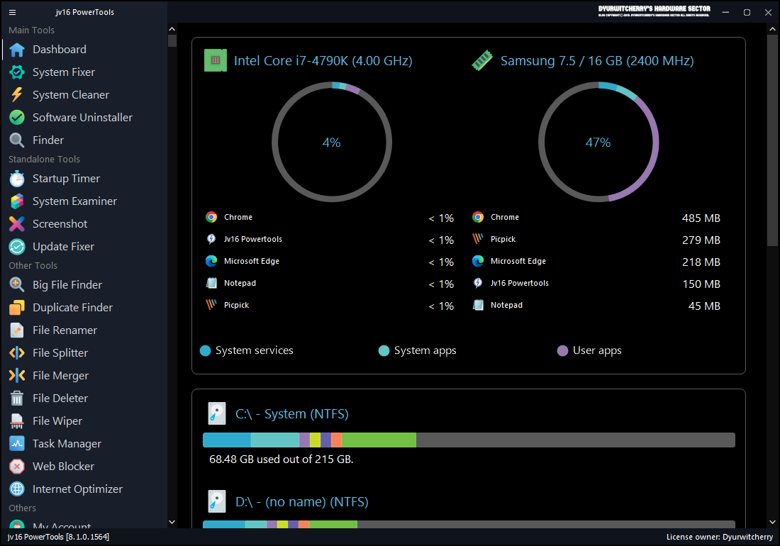 시스템 최적화 프로그램 jv16 PowerTools는 jv16.org에서 개발하여 무료로 배포하였던 레지스트리 정리 프로그램 RegCleaner의 후속 프로그램으로, 윈도우 시스템의 불필요한 정크 파일 삭제와 오류 수정, 프로그램 삭제 후 남아있는 레지스트리 삭제와 함께 인터넷 최적화와 불필요한 소프트웨어 등의 다양한 부가 기능을 가지고 있는 시스템 유틸리티 입니다. jv16 PowerTools는 다국어 지원을 통해 기본 영문판 이외에 한글 윈도우에서는 한글판으로 설치하여 사용할 수 있으며, 포스팅 작성일 기준 최신 버전은 2023년 04월 27일 릴리즈 된 jv16 PowerTools 8.1.0.1564 버전인데, 5 User 기준 1년 라이선스 비용은 $ 19달러, 영구 라이선스 비용은 $ 49달러 입니다.