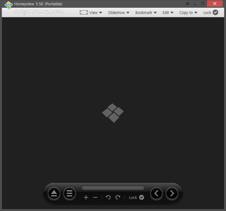무료 이미지 뷰어 프로그램 꿀뷰 5.50 포터블 버전은 압축 파일을 해제하면 약 16.8MB의 크기로, 상단 메뉴와 하단의 네비게이션 바 형태의 단일 인터페이스로 구성되어 있는데, 상단 메뉴 바는 우측의 고정(Lock)을 '✓' 체크하여 고정하거나, 고정을 해제하여 마우스 커서를 위치할 경우에만 메뉴바가 표시 되도록 할 수 있으며, 기본 옵션에서는 영문판으로 실행되며 환경 설정의 언어 설정에서 한국어로 변경할 수 있습니다.
