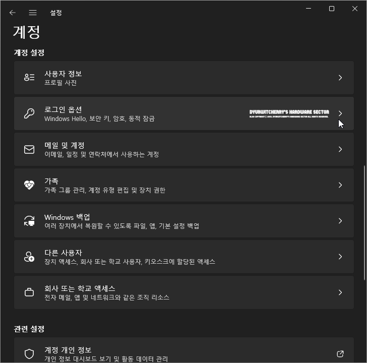 Windows 11 '설정 - 계정'을 선택한 후 '계정 설정'이 활성화 되면 '로그인 옵션 : Windows Hello, 보안 키, 암호, 동적 잠금 >' 항목을 선택합니다. 참고로, TISTORY 블로그 포스팅 시 PC 환경에서 첨부한 이미지 내에 포함되어 있는 텍스트 가독성 향상을 위해 윈도우 11 설정 창을 축소하여 화면 캡처 한 것으로, 디스플레이 해상도 '1024 × 768 XGA'와 '1366 × 768' WXGA 이상 '1920 × 1080' FHD 등의 전체 화면에서는 좌측의 설정 메뉴와 우측의 세부 항목이 함께 표시됩니다.