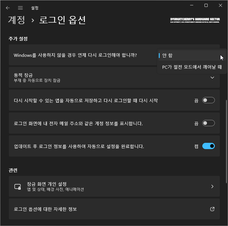 *윈도우 11 PC가 절전 모드에서 전환될 때 다시 로그인 설정 해제하는 방법