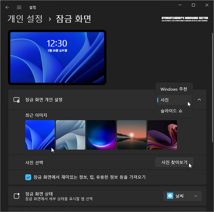 Windows 11 '설정 - 개인 설정 - 잠금 화면'에서 기본 옵션으로 적용되어 있는 '잠금 화면 개인 설정'의 'Windows 추천 ∨' 항목의 더보기 버튼을 클릭하여 '사진' 또는 '슬라이드 쇼' 등으로 선택할 수 있고, 최근 이미지 또는 하단의 '사진 찾아보기' 버튼을 클릭하여 시스템의 디스크 드라이브 등에 저장 되어 있는 이미지 등을 이용하여 잠금 화면 사진을 변경할 수 있습니다.