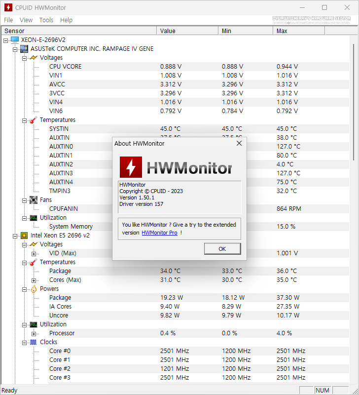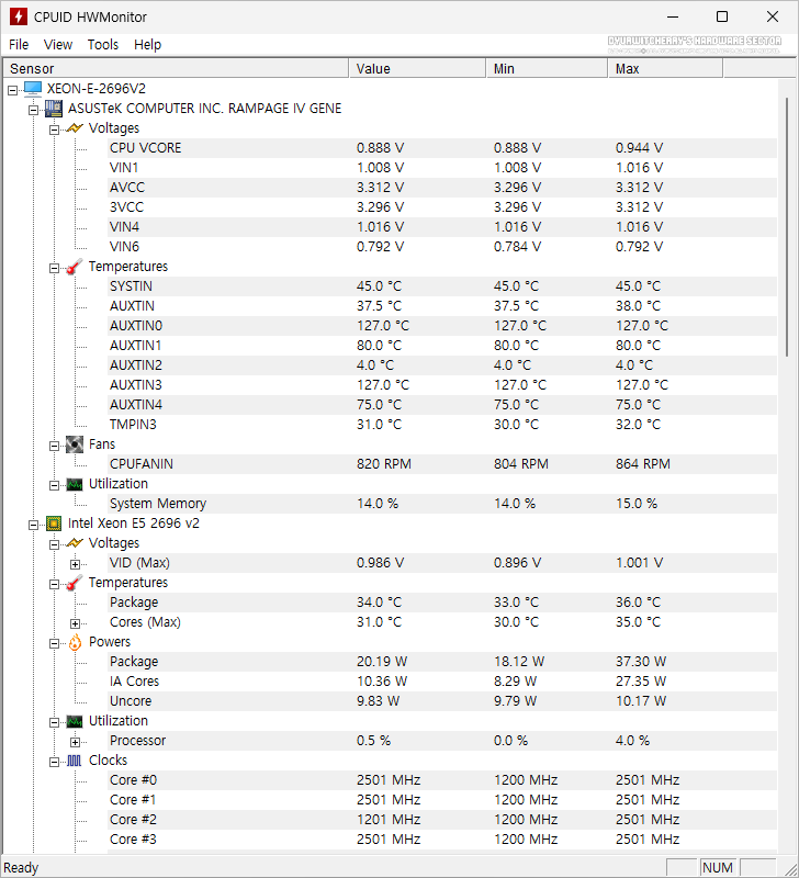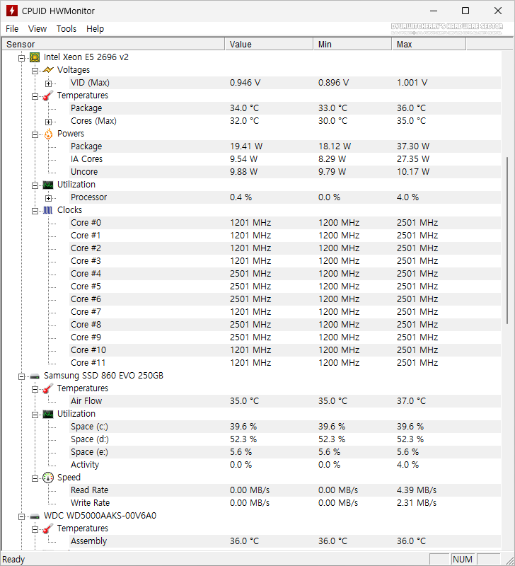 CPUID HWMonitor Free 버전은 Sensor 별 하드웨어가 정렬되어 온도와 전압, 전력과 클럭, 속도 등을 확인 할 수 있으며, 포스팅에 활용한 Intel Xeon E5-2696v2 @ 2.50GHz (12C/24T) 프로세서의 패키지 온도(℃)와 전력(W) 사용량, 코어 별 클럭과 CPU 사용률(%) 등을 모니터링 할 수 있습니다.