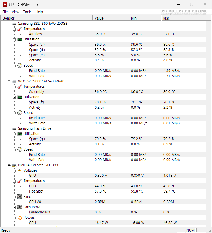 컴퓨터 온도 측정 프로그램 CPUID HWMonitor 1.50.1 Portable 무료 버전은 옵션 메뉴를 이용하여 최신 버전으로 다운로드 하거나 드라이버를 업데이트 할 수 있으며, 모니터링 한 데이터를 저장하고 윈도우 테마에 맞추어 다크 테마를 적용할 수 있는데, 옵션 메뉴에서는 '섭씨(℃ : Celsius)'와 화씨(℉ : Fahrenheit)'의 온도 표시 방법을 변경할 수 있으며, 세부 기능은 프로 버전에서 지원 합니다. 참고로, 포스팅에 활용한 시스템에서는 SAMSUNG SSD 860 EVO 250GB와 Western Digital HDD 500GB의 디스크 드라이브와 MSI GeForce GTX 980 GAMING Twin Frozr 4GB 그래픽카드가 장착되어 있으며, 시스템 하드웨어에 따라 모니터링 할 수 있는 항목에 차이가 있습니다.