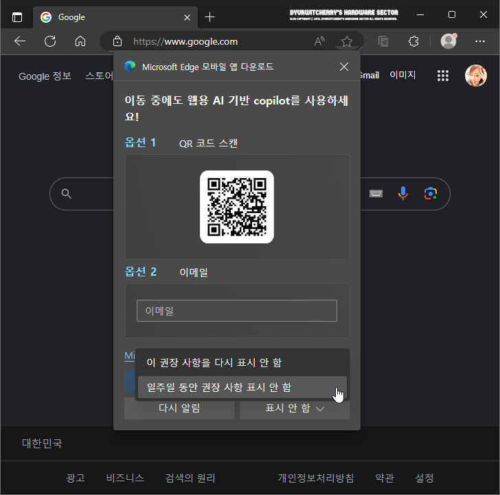 엣지 브라우저 사용 시 'Microsoft Edge 모바일 앱 다운로드' 팝업 창이 나타나는 경우에 하단의 '표시 안 함 ∨' 클릭하여 옵션이 활성화 된 후 '일주일 동안 권장 사항 표시 안 함'을 선택하면, 창을 닫은 후 일주일 후 '이동 중에도 웹용 AI 기반 copilot를 사용하세요.' 알림 팝업 창이 활성화 되어 필요한 경우에 OR 코드 또는 이메일을 이용하여 엣지 모바일 앱을 다운로드 받을 수 있습니다.