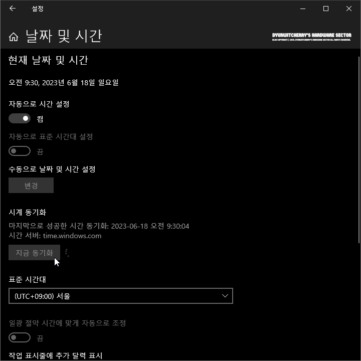 윈도우 10 자동으로 시간 설정에서 시계 동기화 작업이 완료 되면 'ex.마지막으로 성공한 시간 동기화: 2023-06-18 오전 09:30:04 시간 서버: time.windows.com', '지금 동기화 ✓' 버튼에 체크 표시가 됩니다. 참고로, 해외 여행이나 출장 시에는 '자동으로 표준 시간대 설정'을 좌측의 '끔'에서 우측의 '켬'으로 '○' 토글 버튼을 이동 시키거나 '표준 시간대'의 '∨' 더보기 버튼을 눌러 '(UTC+9:00) 서울'에서 해당 지역으로 변경하면 되고, 썸머 타임이 적용되는 미국 등에서는 일광 절약 시간에 맞게 자동으로 조정 값을 '끔'에서 '켬'으로 적용하면 됩니다.