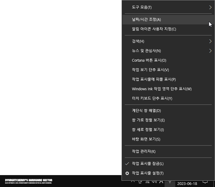 Windows 10 날짜 및 시간 설정 또는 시계 동기화 하는 방법으로 윈도우 바탕화면 하단 우측의 시스템 트레이의 날짜 및 시간 영역에 마우스 오른쪽 버튼을 눌러 활성화 되는 항목 중 '날짜/시간 조정(A)'을 선택하면 '바로 날짜 및 시간' 설정 창이 활성화 됩니다.