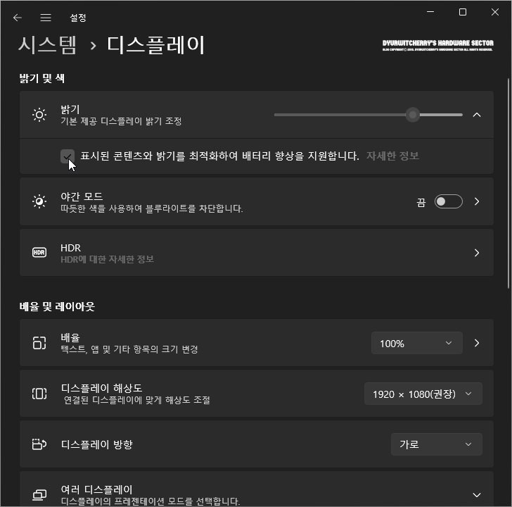 윈도우 11 설정의 '시스템 > 디스플레이'의 '밝기 및 색' 항목 '☼ 밝기 ∧'의 더보기 메뉴가 활성화 되면, '☑ 표시된 콘텐츠와 밝기를 최적화하여 배터리 향상을 지원합니다.' 항목이 체크하여 시스템 자원을 효율적으로 사용할 수 있습니다. 참고로, '자세한 정보'를 클릭하면 '크롬' 또는 '엣지' 등 시스템의 기본 브라우저를 이용하여 마이크로소프트에서 제공하는 배터리 최적화 기능 확인할 수 있으며, 사용 환경에 따라 야간 모드와 HDR 지원 등의 세부 설정을 적용하여 사용할 수 있습니다.
