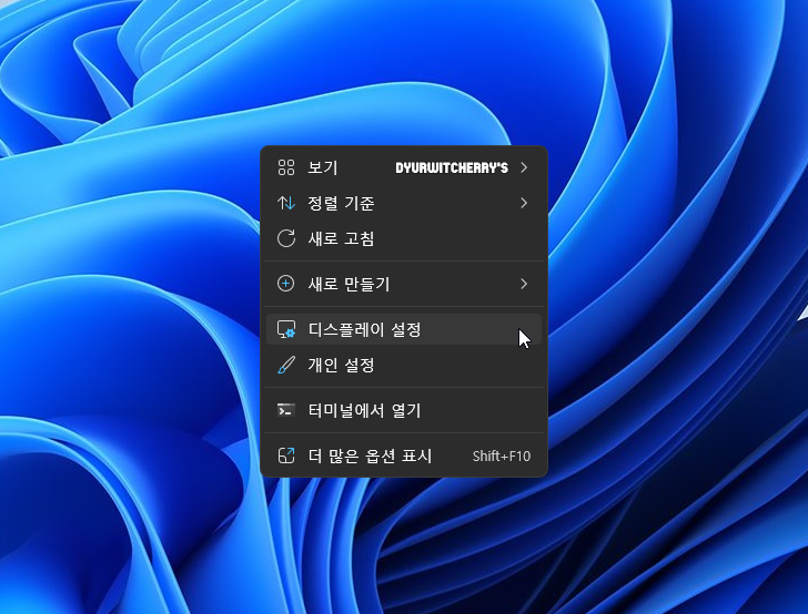 윈도우 11 바탕화면에서 마우스 오른쪽 버튼을 눌러 '디스플레이 설정' 항목을 선택하면, 설정 메뉴의 '시스템 > 디스플레이' 창이 바로 활성화 되어 설정 메뉴에서 모니터의 디스플레이 밝기를 조정 할 수 있습니다.