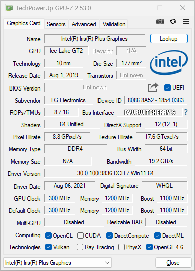 GPU-Z 포터블 버전을 실행하면 Graphics Card 탭에서 그래픽카드의 제조사와 모델명, GPU 네임과 제조공정, GPU와 그래픽 메모리의 클럭, 그래픽 메모리 용량과 대역폭 등의 세부 정보를 확인할 수 있습니다. 참고로, 포스팅에 활용한 노트북 시스템은 Intel Core i7-1065G7 @ 1.30GHz (Turbo: 3.90 GHz) 4C/8T/8M 프로세서를 사용하는 LG gram의 Intel(R) Iris(R) Plus Graphics Ice Lake GT2 입니다.