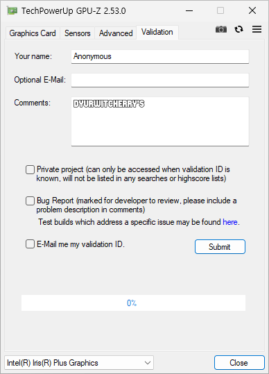 테크파워업의 그래픽카드 온도와 사양 등 정보 확인 프로그램 GPU-Z 2.53.0 버전의 확인(Validation) 탭에서는 하드웨어 시스템의 그래픽카드 정보를 TechPowerUp 사이트로 전송하여 데이터베이스 구축에 참여하고 다른 시스템의 하드웨어와 성능을 비교할 수 있으며, 포럼을 통해 활용 팁이나 최적 드라이버 버전, 버그 등의 문제점을 해결할 수도 있습니다. 참고로, 그래픽카드 온도는 계절에 따른 실내 온도와 함께 그래픽 쿨러, CPU와 저장장치 등 다른 하드웨어에도 영향을 받을 수 있으며, 게임 등 GPU와 그래픽 메모리 사용량이 증가할 수록 온도가 높아지게 됩니다.