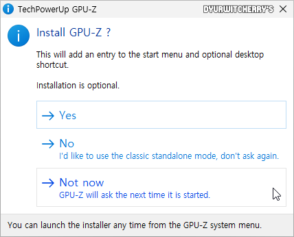 그래픽카드 온도와 사양 등 정보 확인 프로그램 GPU-Z 2.53.0 포터블 버전을 다운로드 실행하면 'TechPowerUp GPU-Z' 창이 활성화 되어 '! Install GPU-Z ?' 메시지가 나타 나는데, '🡲 Yes' 버튼을 눌러 설치 후 사용하거나 '🡲 No' 또는 '🡲 Not now'를 선택하면 설치 과정 없이 바로 프로그램이 실행 됩니다.