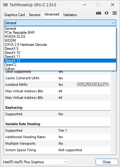 GPU-Z Advanced 탭의 'General' 항목에서는 드라이버 버전(날짜)과 파워, 온도 한계 등 그래픽카드의 하드웨어 관련 세부 정보와 사양을 확인할 수 있으며, '∨' 더보기 버튼을 클릭하여 PCIe Resizable BAR와 NVIDIA DLSS, WDDM과 DXVA 2.0 Hardware Decode, DirectX 9·10·11·12, OpenCL과 CUVA, Vulkan 등을 선택하면 항목 별 세부 하드웨어 정보가 표시됩니다.