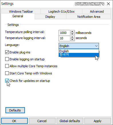 Core Temp Settings 창이 활성화 되면 상단 메뉴 중 'General' 탭을 선택한 후 'Language:' 옵션에 기본 값으로 적용되어 있는 'English ∨' 항목의 더보기 버튼을 클릭한 후 '한국어'를 선택한 후 'Apply' 버튼을 누르면 코어 템프 한글판으로 적용 됩니다. 참고로, '☑ Check for updates on startup' 항목을 '□' 체크 해제하면 시작 시 새로운 버전이 릴리즈 되었는지 확인하지 않고 되는데, Core Temp 1.18 버전은 영어 외에 25개 국가의 다국어 지원하며, 코어 템프 포터블 버전에는 일부 메뉴를 직접 수정한 한국어 파일만 포함하여 파일 크기를 최소화 하였습니다.