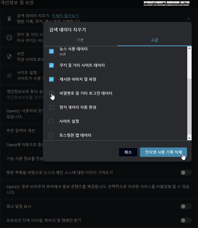 Opera Browser 검색 데이터 지우기의 '고급' 탭에서는 '☑ 탐색 기록'과 '☑ 다운로드 기록', '☑ 뉴스 사용 데이터'와 '☑ 쿠키 및 기타 사이트 데이터', '☑ 캐시한 이미지 및 파일'은 기본 옵션에서 체크되어 있으며, '□ 비밀번호 및 기타 로그인 데이터'와 '□ 양식 데이터 자동 완성', '□ 사이트 설정'과 '□ 호스팅 된 앱 데이터'는 체크 해제되어 있어 사용 환경에 따라 '☑' 체크 또는 '□' 체크 해제한 후 '인터넷 사용 기록 삭제' 버튼을 누르면 방문기록과 쿠키 및 캐시 등이 삭제 됩니다.