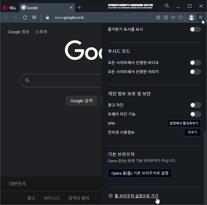 오페라 브라우저에서 방문기록과 쿠키 및 캐시 등 방문기록 삭제하는 방법은 먼저, Opera Browser 상단 도구모음 우측의 '☰' 쉬운 설정 버튼을 클릭하여 아래로 활성화 되는 메뉴의 스크롤바를 내려 가장 하단의 '☼ 풀 브라우저 설정으로 가기' 항목을 선택 합니다.
