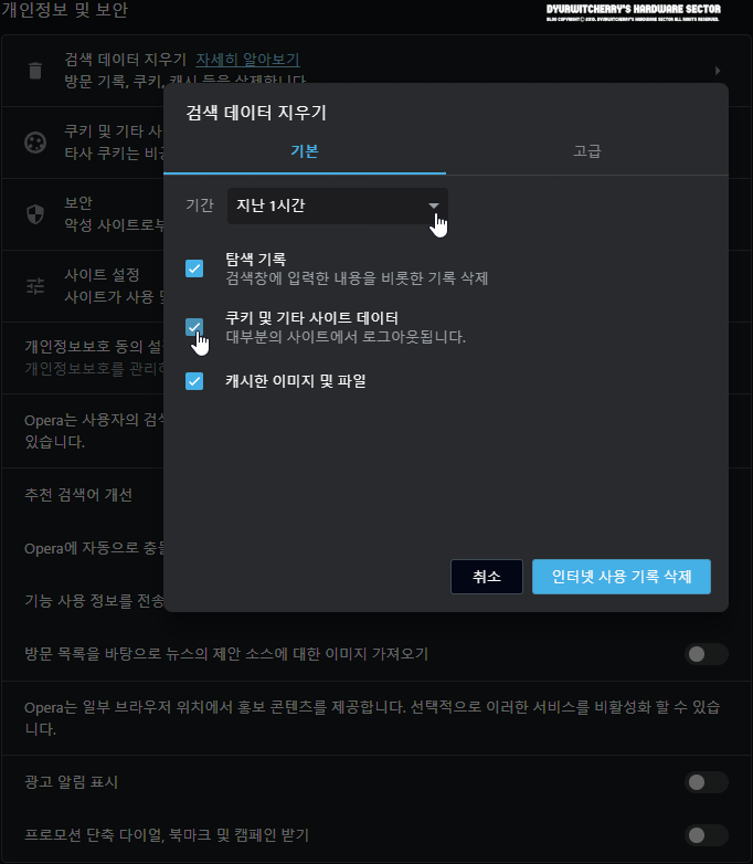 Opera Browser 개인정보 및 보안 항목의 '검색 데이터 지우기' 창이 활성화 되면 '기본' 탭의 '☑ 탐색 기록'과 '☑ 쿠기 및 기타 사이트 데이터', '☑ 캐시한 이미지 및 파일' 항목이 모드 체크되어 있으며, 자동 로그인 기능을 사용하는 경우에는 '□ 쿠키 및 기타 사이트 데이터' 항목을 체크 해제하면, 인터넷 사용 기록을 삭제하여도 로그아웃 되지 않습니다.
