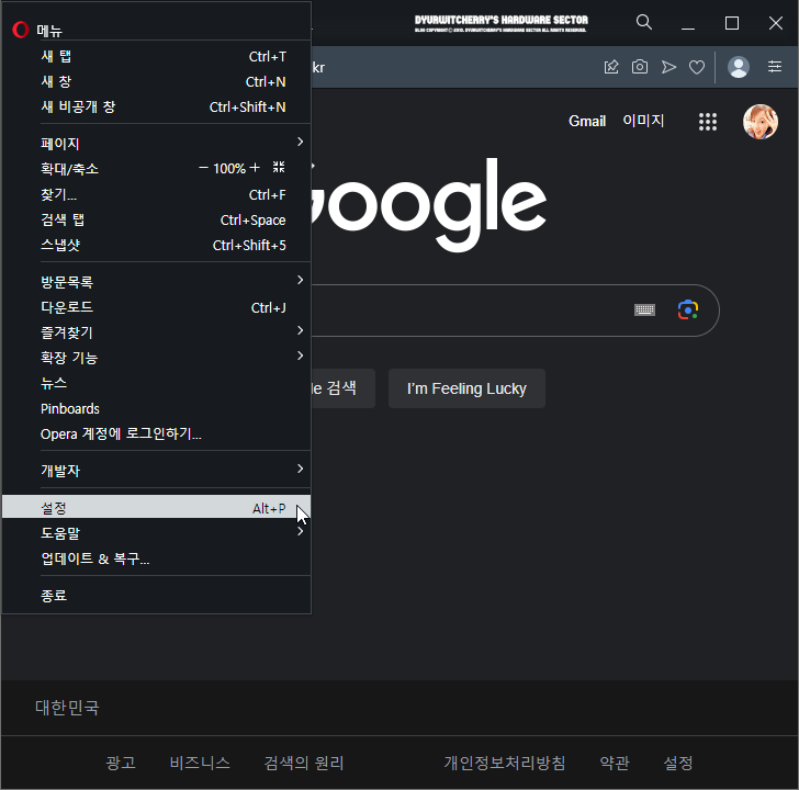 오페라 브라우저 검색 데이터 지우기 : 방문기록과 쿠키 및 캐시 삭제하는 방법으로, Opera Browser 좌측 상단의 'O 메뉴' 버튼을 눌러 하단으로 활성화 되는 메뉴 중 '설정' 항목을 선택하거나, 키보드에 단축키 'Alt + P'를 입력하면, 브라우저 설정에 따라 현재 창 또는 새 탭, 새 창으로 '☼ 설정' 창이 활성화 됩니다.