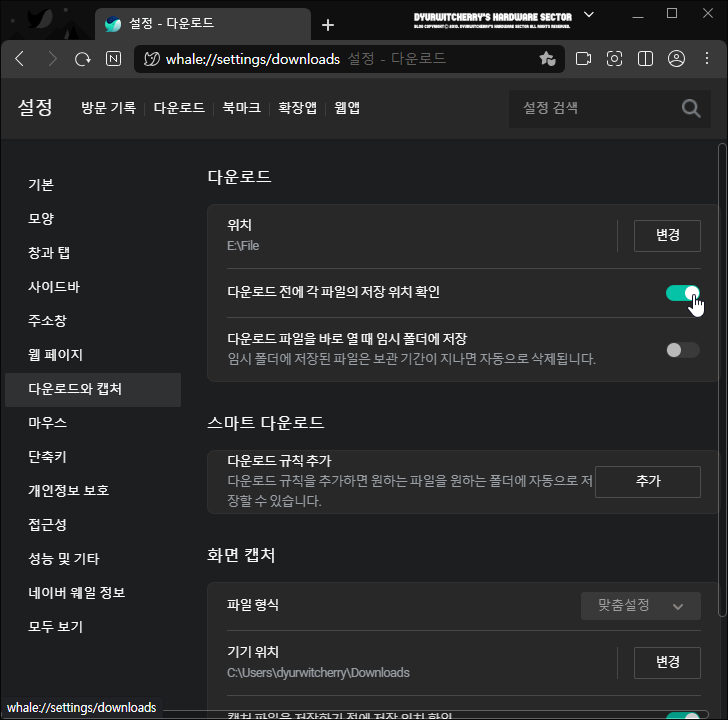 2. 네이버 웨일 브라우저 다운로드 위치 폴더 경로 변경하는 방법
