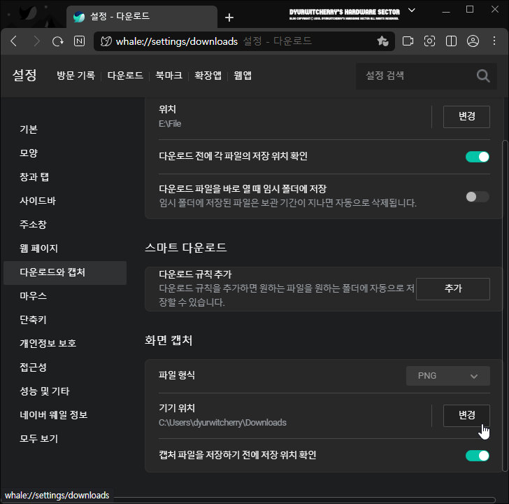 2. 네이버 웨일 화면캡처 저장 위치 변경 및 캡처 파일 형식 설정하는 방법