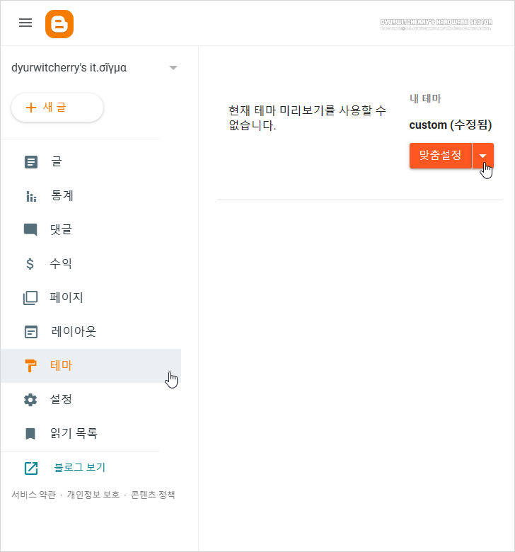 Google Blogspot의 포스팅에 마우스 오른쪽 버튼 사용 금지 설정을 적용하기 위해서는 먼저 구글 계정에 로그인 한 후 Blogger 메인 페이지 좌측 상단의 '☰' 메뉴 항목 중 하단의 '테마'를 선택 한 후 우측 '내 테마 custom (수정됨)'의 '맞춤설정 ▾' 항목의 더보기 버튼을 클릭합니다.